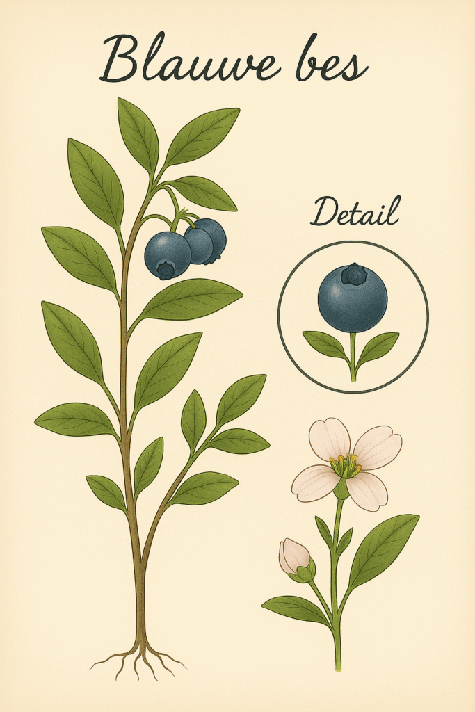 De blauwe bosbes is een struikvormige plant uit de heidefamilie (Ericaceae), met ovaalronde blaadjes en blauwpaarse bessen. De Vaccinium myrtillus groeit in bosrijke gebieden en produceert kleinere, sterk gekleurde bessen met een intens aroma. Vaccinium corymbosum, de gekweekte variant, draagt grotere, lichtzoete vruchten. De paarsblauwe kleur duidt op de aanwezigheid van anthocyanen, wat wijst op een werking op de bloedvaten en het zenuwstelsel. De blauwzwarte kleur en vorm van de bessen doet denken aan het oog, een oude signatuur die duidt op de werking op het gezichtsvermogen.